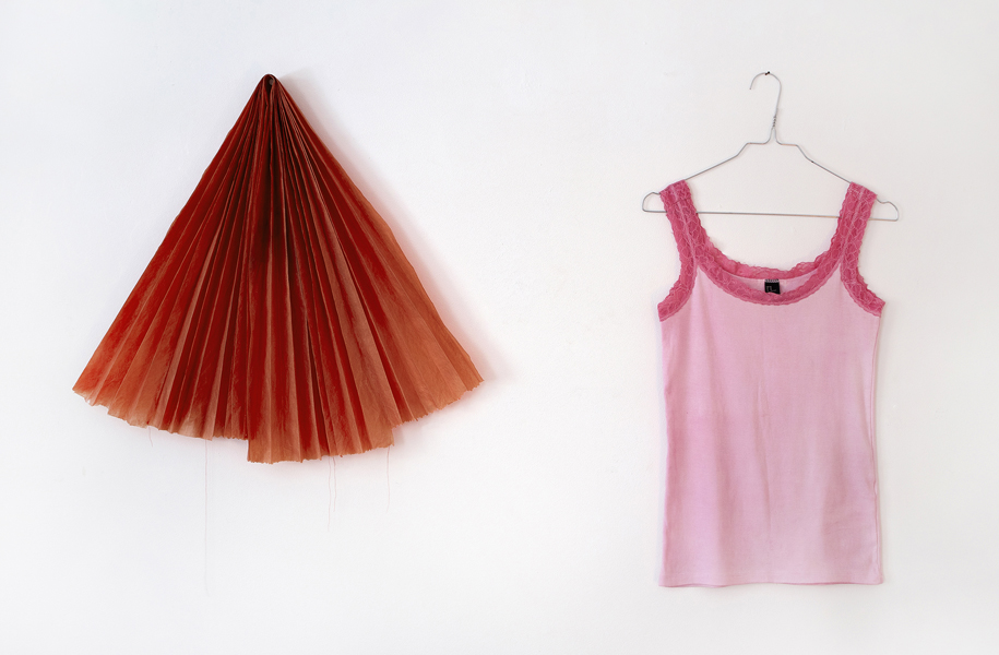 Udstillet på ”HUN-cochenille” Mellemrummet, Godsbanen Aarhus 2022. Foldet pergament 60x70 cm. Stropbluse, bomuld 80x40 cm. Begge dele farvet med Cochenille-hunlus 2022. Foto: Lisbeth N. Lyrstrand IDOART, "VIS OS DIT KARANTÆNE-ATELIER #2": |